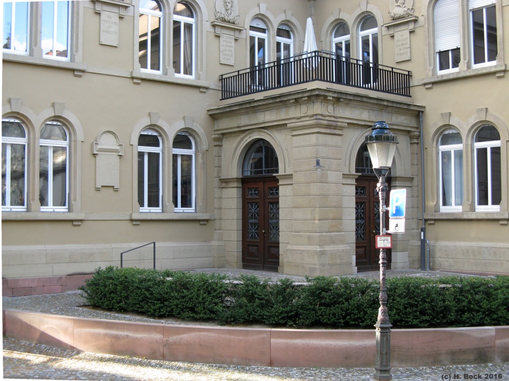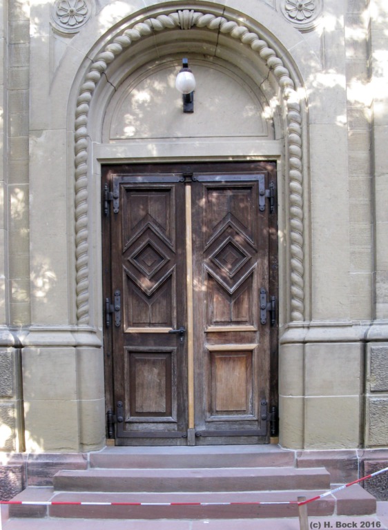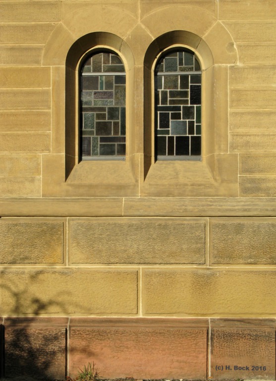 EckeZasius-/Turnseestr, 1889‒1891. Sockel, Stufen: roter Sandstein (Buntsandstein), Mauerwerk: Schilfsandstein: gelblicher, feinkörniger Sandstein („Mühlbacher Sandstein“ aus den früheren Steinbrüchen bei Sulzfeld SW Eppingen im Kraichgau). Altes Pfarrhaus (Ecke Maien-/Turnseestr.), 1892‒1893, Neues Pfarrhaus (Maienstr.), 1895‒1896: gleiche Fassadengestaltung! Barrierefreie Sanierung Vorbereich neues Pfarrhaus/Gemeindehaus (2014): Sockel-/Rundmauern und Stufen aus "Rothbacher Sandstein" (Buntsandstein, Vogesensandstein-Fm., Elsass), Belag Weg und Auffahrt: Spaltkieselpflaster. Sanierung Christuskirche (6/2015‒12/2016): Vorbereich: „Rothbacher Sandstein“ (Stufen). Der "Rothbacher Sandstein" wird übertägig seit 1983 schonend mit einem Hochdruckwasserstrahl abgebaut. Wegen der sehr großen Abraummächtigkeit werden die Blöcke seit 2012 auch untertägig in großen Kavernen mit Schrämmsägen gewonnen.