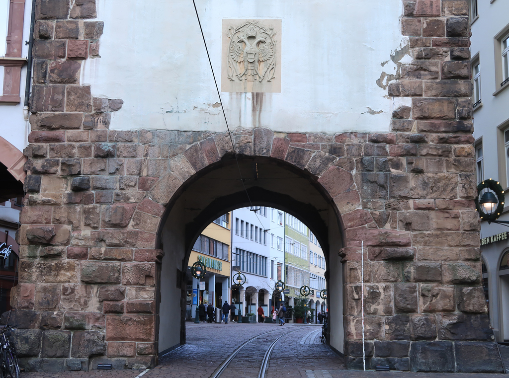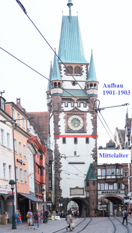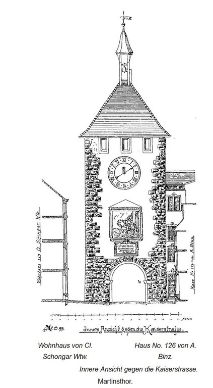 Mauerwerk: Sandsteine des Buntsandstein. In den unteren Lagen sind große Buckel-quader mit auffallend vielen gelblichen und gelbgrauen Mittelsandsteinen verbaut (Kantenlänge bis 1,15 m; vgl. Fotogalerie). Werner et al. (2022: 82) halten es u. a. wegen der Größe der Quader für wahrscheinlich, dass die gelben Sandsteine vom Hornwaldrücken bei Emmendingen kommen (vgl. Einführung, Hinweise Hochmittel-alter). Vermutlich sind in diesem unteren Teil des Martinstors auch Sandsteine vom Lorettoberg verbaut worden.